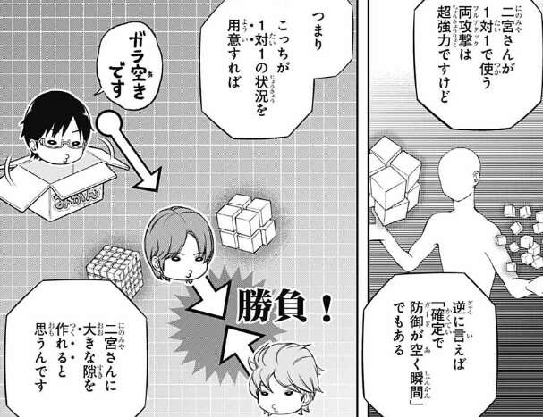 何度もヒュースは試しているようですが、先手を取られると厳しいらしく活動限界を迎えています。烏丸は1対1の設定に疑問を持ち、二宮にフルアタックを「使わせない」対策をするべきでは、と言います。しかし三雲は1対1の状況で使うフルアタックは超強力だが、逆に「確定でガードが空く瞬間」でもあり、大きな隙を作れるという考えです。