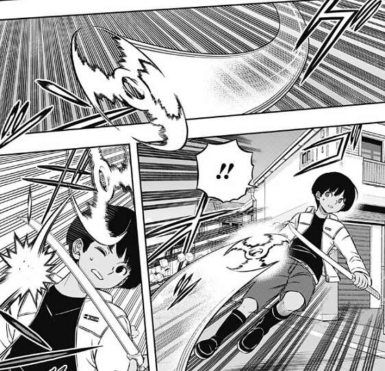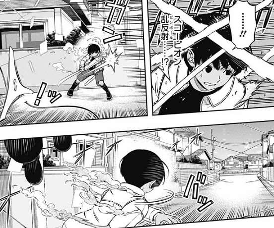 以前、空閑のスコーピオン投げを見ていた帯島は下がって避けようとしますが、空閑が投げたスコーピオンは途中で曲がり帯島を追尾します。