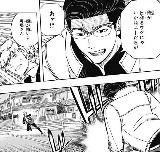 一方、二宮隊の犬飼を追いかけている弓場ですが、犬飼がガン逃げしているのでなかなか追いつけずにいます。犬飼から帯島の方に行かなくていいのかと言われますが、弓場はあくまで犬飼を追い詰めようとします。