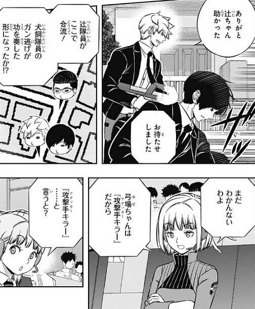 弓場は二宮隊の犬飼を追い詰めたように見えましたが、辻、そして隊長の二宮と二宮隊が全員揃ってしまい、逆に弓場は絶体絶命のピンチです。
