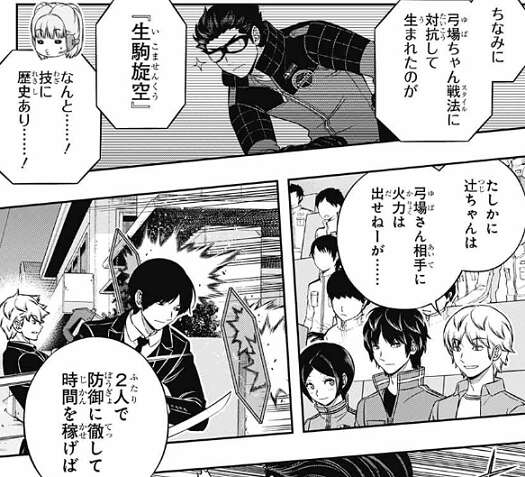この間合いを保っていれば、弓場は一方的に攻撃手をボコボコにできるそうで、さらに弓場戦法に対抗して生まれたのが「生駒旋空」だそうです。しかし、犬飼と辻の二人で防御に徹して時間を稼いでいると。