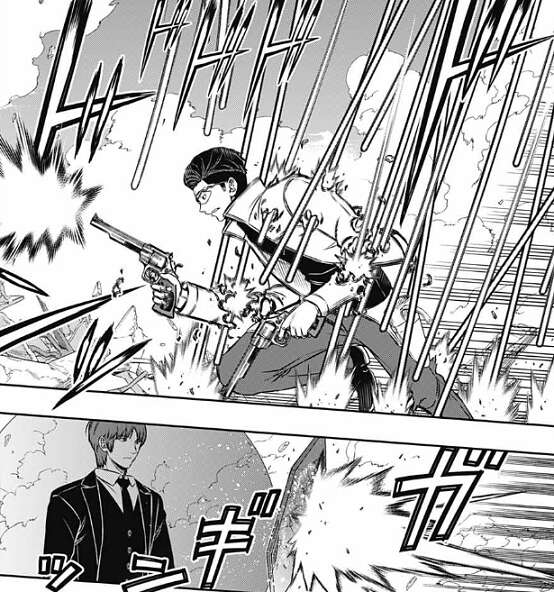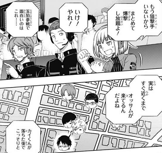 二宮は強化追尾弾(ホーネット)で迎撃し爆撃を何とか防ぐ二宮隊、そしてその隙に弓場が辻を狙撃し狙います。