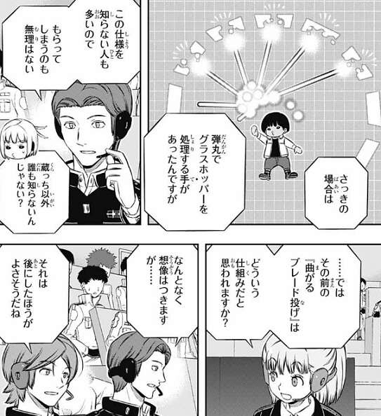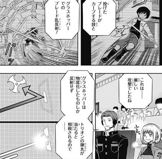 前回、空閑が新技のコンボで帯島を仕留めましたが、その新技コンボは投げたブレードがカーブする技と、グラスホッパーでのブレード乱反射(ピンボール)のコンボでした。解説席の小南が空閑の新技コンボの解説を聞きながら、ふむっと満足気です。