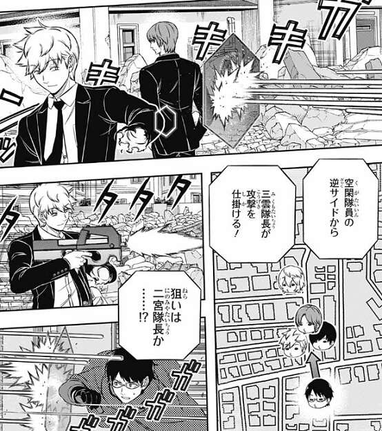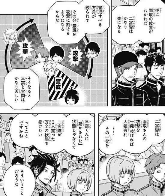 二宮の炸裂弾(メテオラ)は雨取がガードして無事でしたが、犬飼と辻に雨取を抑えるように二宮は指示を出します。犬飼と辻は雨取を狙う動きをし、二宮本人は三雲と空閑の二人を一人で相手にしようとします。