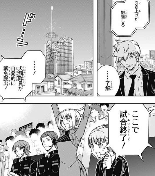 二宮は、犬飼に撤退を指示し、犬飼は自発的に緊急脱出(ベイルアウト)します。試合終了となり、解説席の小南が玉狛第2の勝利に大喜びです。