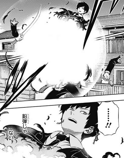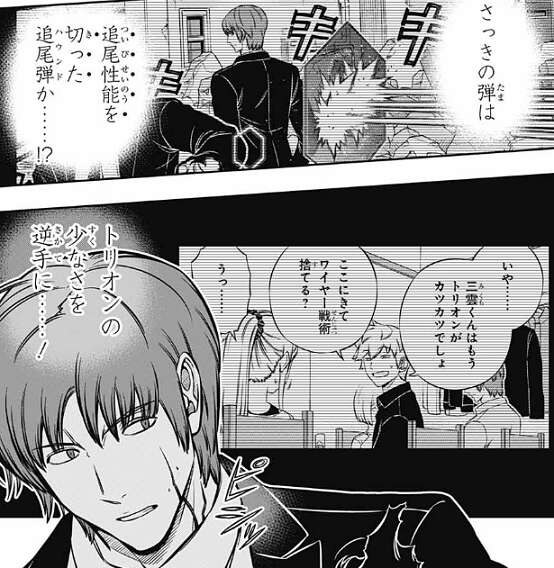 しかし、雨取の狙撃は鉛弾(レッドバレット)ではなく通常弾で、辻を直撃し緊急脱出(ベイルアウト)させることに成功します。辻が狙撃された事を気にして、二宮は辻の方に注意を払いますが、その隙を狙って三雲は二宮に対して攻撃します。