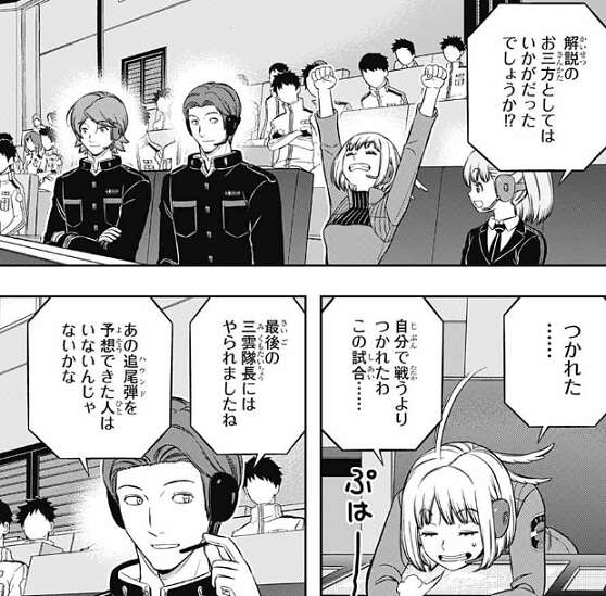 そこに空閑と三雲も戻ってきて、二人もヒュースと拳と拳を突き合わせています。三雲はヒュースから「別案(オプション)」が上手くはまったなと言われますが、三雲はまだ実感がないようです。解説席では小南が大きく伸びをしながら、自分で戦うよりつかれたわこの試合、と大きくため息をしています。三雲の追尾弾(ハウンド)を予想できた人はいないんじゃないかな、と蔵内は言い、王子も終わってみれば「その手があったな」と思うのに、なんで予想できなかったんだろう…、と疑問を口にしています。