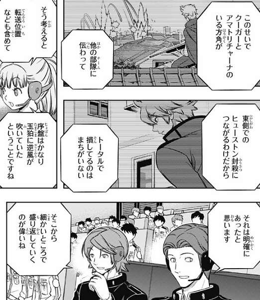 その後、雨取の遠距離からの爆撃が外岡の狙撃で阻止され、ヒュースは包囲からの脱出を試みますが失敗していますが、ここがポイントだと王子は言います。ヒュースが強引に二宮の方に向かおうとする動きと、派手に炸裂させた変化弾(バイパー)のインパクトでヒュースの隠し玉が二宮に対する切り札だった、という印象を強く植え付けています。これで、三雲が隠し持ったもう一つの切り札からみんなの意識を逸らせています。