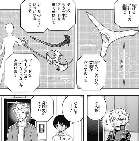 ヒュースが落ちた後、スナイパー二人と南沢も相次いで脱落し、MAP東側では空閑と帯島が、MAP西側では弓場と二宮隊がそれぞれ戦う形になりました。ここで空閑の新技、「曲がるブレード投げ」の解説を蔵内が行っていますが、映像を見直すと曲がるブレード投げの時に、光る細い線が見えています。投げるブレードの裏面に突起を作って、そこへもう一本のブレードを細く伸ばしてレールの様にひっかけることで、ブレードをカーブさせていたようです。光る細い線は、もう一本の細く伸ばしたブレードのようです。