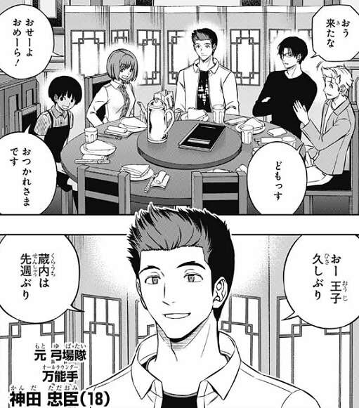 後日、弓場隊と王子隊の王子と蔵内が集まって、食事会を開いています。元弓場隊、神田の門出を祝って集まったようです。
