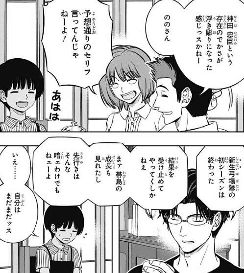 弓場隊の今回のシーズンに関しては8位に終わり、予想通り神田から自分という存在のでかさが浮き彫りになった感じっスかねー、と言われてしまいます。しかし帯島の成長も見れたので、先行きはそんなに暗いわけでもないと弓場は言います。