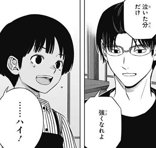 神田からも、帯島はこっからどんどん強くなるさ、と言われると、帯島は試合中に空閑にも、おびしまちゃんは強くなるよ、おれが保証する、と言われた事を思い出し、思わず泣き出してしまいます。やっと、負けて悔しいと思えてきて、涙があふれて来たようです。