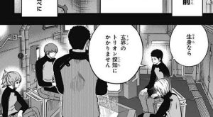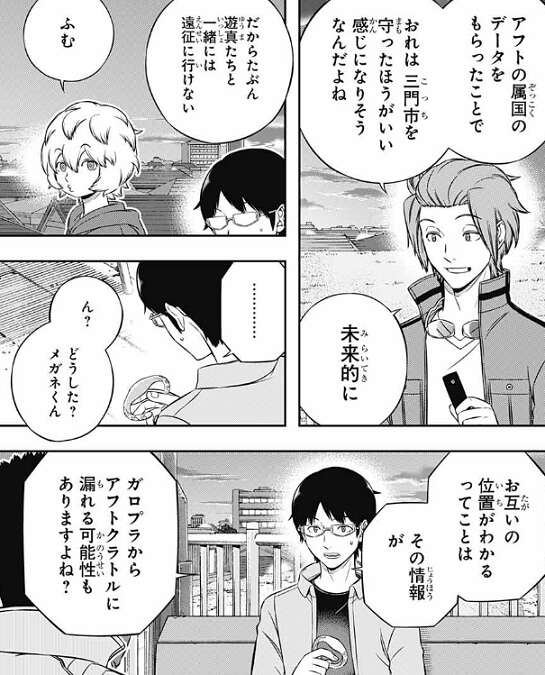 このトリガーがあれば、どれだけ離れていてもお互いの位置は常に分かり、ある程度星が近づければ通信ができて、ほかのトリガーに傍受されることもないそうです。迅はこれを遠征にもっていくと言い、三雲に渡します。三雲は迅が持っていた方がいいと言いますが、アフトクラトルの属国のデータを貰った事で、三門市を守った方がいい感じになりそうと、迅は三雲と空閑に言います。サイドエフェクトで未来を見たようで、迅は今度の遠征にも一緒には行けないようです。三雲はお互いの位置が分かるということは、ガロプラからアフトクラトルに漏れる可能性を心配します。
