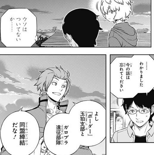 その点に関しては、我々を信用していただくしかありませんね、とラタが言うと、三雲もウソはついていないと判断します。今の話は忘れてください、と三雲は言い、『ボーダー』玉狛支部と、ガロプラ遠征部隊の同盟締結が決定します。