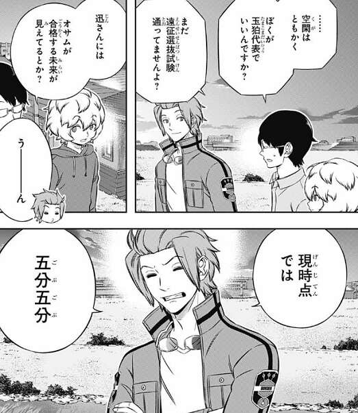 三雲は、空閑はともかく自分はまだ遠征選抜試験を通っていないのに、玉狛代表でいいのか、迅に聞きます。空閑は、三雲が遠征選抜試験に合格する未来が見えているのか、と迅に聞きますが、現時点では五分五分と迅は明かします。