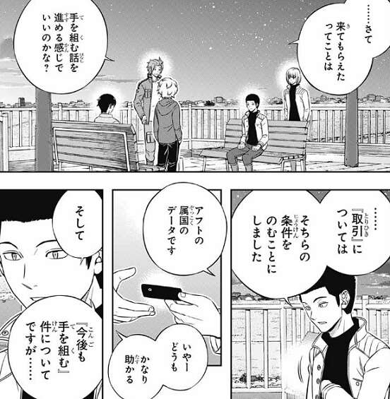 場面が変わり、迅と三雲と空閑が待ち合わせ場所に到着すると、ラタとレギーが待っています。お互い自己紹介をした後、ラタは迅達に取引については条件をのむことにしました、とアフトクラトルの属国のデータを渡します。