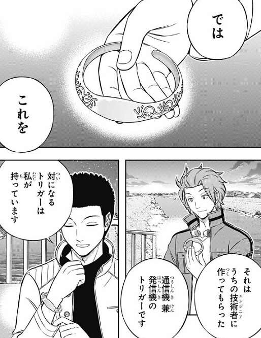 そして今後も手を組む件については、ラタは「あるもの」を持ってきていて、それが何か未来を読んで当てられるか、ラタは迅のサイドエフェクトを試します。すると、迅はラタが持ってきた物は銀色の輪っかで、植物の模様が彫ってあると当てます。迅の予測は当たっていて、銀色の輪っか、ブレスレットはガロプラのエンジニアが作った通信機 兼、発信機のトリガーでした。対になるトリガーはラタが持っています。