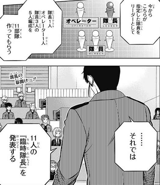 そして最後にということで、今回の選抜試験は部隊の隊員をシャッフルして行うそうです。今から忍田本部長が指定した11人がリーダーとなり、隊長1人、オペレーター1人、隊員3人の5人編成を11部隊作るそうです。そして、忍田本部長から11人の『臨時隊長』が発表されます。