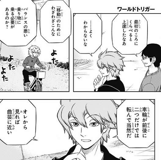 ヒュースは、移動のためにわざわざこんなバランスの悪い乗り物に乗る必要があるか?と疑問を口にします。車輪が前後二つしかないから、オレから見れば曲芸に近いと言っています。こっちの世界は地面がかなり平らだから、自転車に乗れると便利だ、トリオンも食わないし、と空閑がヒュースに説明します。