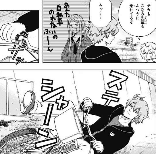遠征選抜試験を前に、玉狛第二の隊員は集まって空閑の自転車の練習を見ています。以前に比べると、乗りこなしていますがスピードはまだ、よたよたとしたレベルです。