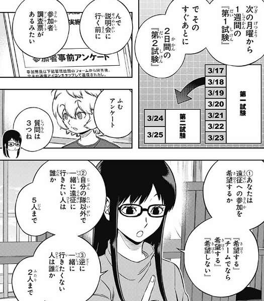 そこに宇佐美から、選抜試験の日程がでたと聞かされます。内容は、3/13に試験の全体説明会、3/16に隊長面接、3/17から第1試験実施、3/24から第2試験実施とあります。次の月曜から1週間の『第一試験』、そのあとすぐに2日間の『第二試験』だそうです。さらに説明会前に、参加者アンケートがあります。①遠征への参加を希望するか、希望する、チームでなら希望する、希望しないの3つから②自分の隊以外で一緒に遠征に行きたい人は誰か、5人まで③逆に一緒に行きたくない人は誰か、2人まで、の3つです。