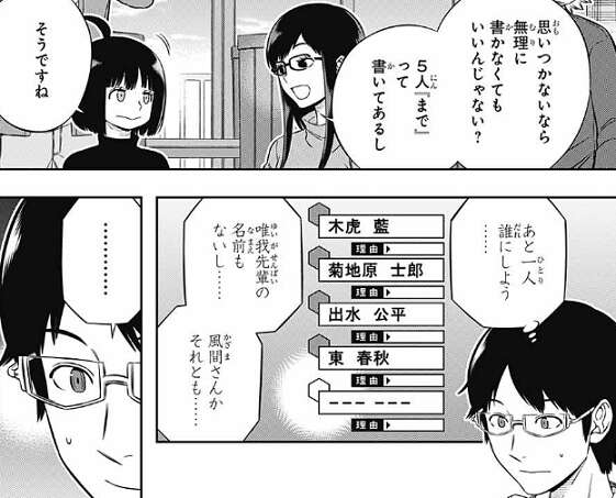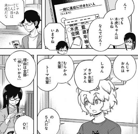 雨取は絵馬を選びますが、師匠の木崎や仲の良い夏目、那須隊の先輩たちがいないので、他は無理に選ばないようです。三雲は、木虎、菊地原、出水、東を選んだあと、最後の1人で悩みますが、二宮を選んで送信します。話の中では語られていませんが三雲の遠征に行きたくない人の名前に、香取の名前が見えます、三雲は苦手なのでしょう。