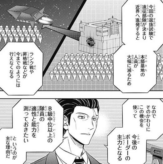 また次回の遠征は乗組員を従来より大幅に増員する予定のため、遠征選抜への参加資格を得ていない部隊からも個人で幾人か遠征隊員を選ぶ可能性がある、と城戸は全員に説明します。これは以前、木戸が三雲達に説明した内容です。最終的に遠征に参加するかは本人次第のようですが、断っても選抜試験に通ったという実績と評価は消えることはないそうです。