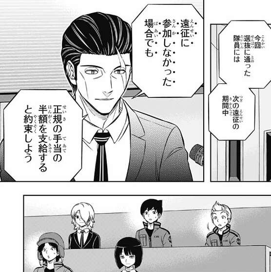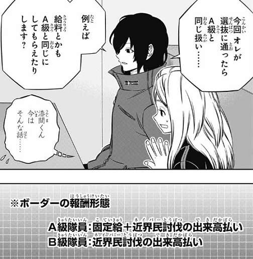 しかし、残念だがそれは不可能だ、A級の待遇はA級の選抜試験によってのみ与えられると、城戸から言われます。しかし、試験の結果に見返りが欲しいという気持ちは理解できると城戸は言い、従来の規定でネイバーフット遠征の参加部隊には基本給や成果報酬とは別に、1日につき1万円の遠征手当てが支払われていて、今回選抜試験に通った隊員には、遠征に参加しなかった場合でも正規の手当の半額を支給すると、城戸は約束します。次の遠征は間違いなく過去最長のものになるので、半額とはいえある程度まとまった金額になるはずだ、と城戸は補足します。それを聞いて漆間はニヤリと笑い、納得します。