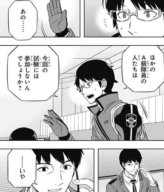 最後に三雲から、ほかのA級隊員の人たちは、今回の試験には参加しないんでしょうか?と、質問があります。すると、ここにいないA級隊員は第2試験から全員参加する、と忍田は説明をします。