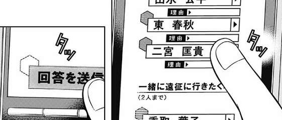 一方、同じチームに絵馬が選ばれて嬉しい雨取は、満面の笑みで絵馬に手を振っています。そして、北添が南沢を、王子が帯島を、歌川が自動的に巴を指名となります。
