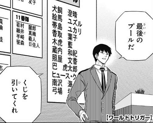 香取は三雲と同じチームになって驚いています。そして、諏訪におとなしく木虎とかにしといてよ!と文句を言っています。三雲も香取が同じチームという事で、少し複雑そうです。古寺が木虎を、柿崎が犬飼を、村上が蔵内を、水上が照屋をそれぞれ指名ます。
