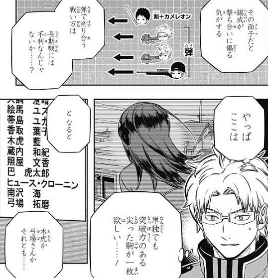 そして二宮の番ですが、二宮は正直誰でもいいと考えますが、その時絵馬は雨取と仲が良かった事を思い出します。そして、二宮はちらりと絵馬の方を見ます。