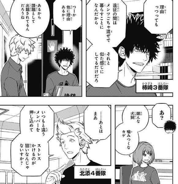 柿崎3番隊では影浦が、遠征の間はメンツごちゃ混ぜで暮らすことになんだから、それと似た感じにしているだけで、他に理由あるか?と疑問を口にしますが、犬飼は、あるから課題として出題されているんだろうね、と言うと影浦が犬飼に噛みつこうとします。