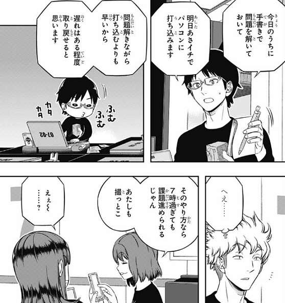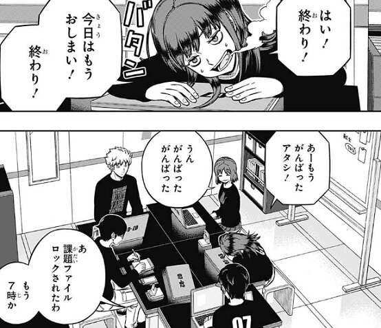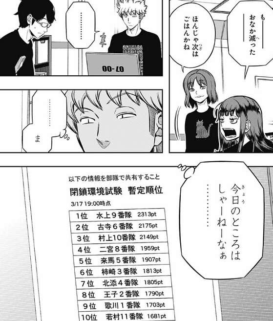 諏訪からどうする?と聞かれ、三雲は、なんとかします、と言うと考え始めます。そして、隠岐のパソコンの画面に映っている共通課題の問題文を、三雲は通信デバイスについているカメラで映し始めます。問題文をカメラで映して今日のうちに手書きで問題を解き、明日のあさイチでパソコンに解答を打ち込み、これで遅れをある程度取り戻す、と三雲は対応策を説明します。それを聞いて宇井も、7時過ぎても課題を進められると、カメラで問題文を撮ろうとします。香取は7時を過ぎて課題をするのは嫌のようで、えぇ~……?と、声を漏らします。結局、若村が臨時隊長に選ばれた理由は有耶無耶になり、特別課題の意見をまとめることになります。
