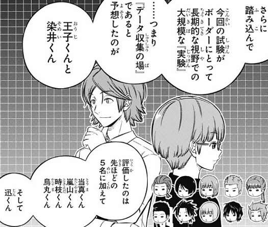 提出された解答だけでなく、解答までの過程で出た意見も見せてもらおう、と城戸が言うと、審査官の評価が集中している部分を根付が取り上げます。犬飼、弓場、古寺、諏訪、二宮、荒船、蔵内が、将来的なボーダー幹部、もしくは隊長候補をテストしている可能性について触れていて、審査官の冬島、真木、綾辻、木崎、林藤ゆりが評価しています。さらに踏み込んで王子と染井が、今回の試験がボーダーにとって長期的な視野での大規模な『実験』、『データ収集の場』であると予想しています。この意見を評価したのが、先ほどの五名に加えて、当真、嵐山、時枝、烏丸、迅が評価しています。
