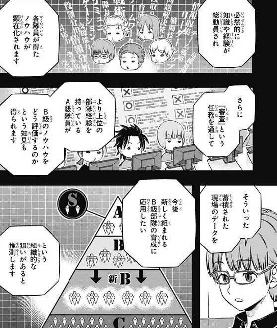 経験を積んだ隊員たちが『できたてのチーム』で、短い試験機関の中で結果を出そうとすれば、必然的に知識や経験が総動員され、各隊員が得たノウハウが顕在化されます、と染井は言い、さらに『審査』という任務を通して、より上位の部隊経験を持っているA級隊員が、B級のノウハウをどう評価するのか、という知見も得られる、と言います。そういった蓄積された現場のデータを、今後新しく組まれるB級部隊の育成に応用したい、と染井は組織的な狙いを推測します。ただ、この意見は染井、王子ともに、想像に想像を重ねている、として、提出候補から外れたようです。