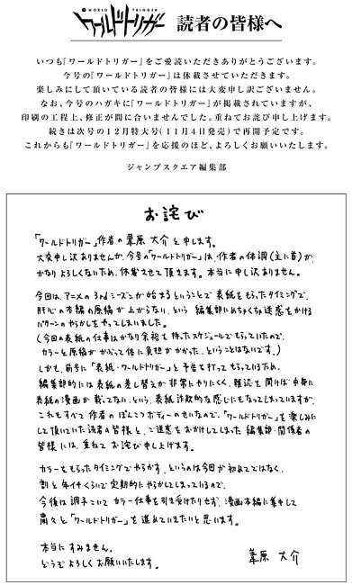 今月のジャンプSQ 2021年11月特大号に掲載される予定だったワールドトリガー 214話ですが、作者 葦原大介先生 体調不良のため、休載となっています。アニメ3rdシーズン直前のタイミングという事で、表紙にでかでかとワールドトリガーが載っていただけに、作者 葦原大介先生も、本当に申し訳ありません、とコメントを出しています。