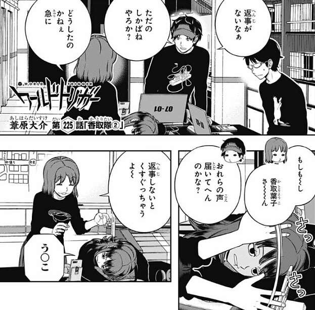 なんか……急にやる気なくなったわ、と言った香取はそのまま机に突っ伏してしまうと、何も返事をしなくなってしまいます。隠岐や宇井が話しかけても無反応で、返事しないとくすぐっちゃうよ~、と宇井が言うと、さすがに香取は反応しますが、言語を喪失してしまっています。香取の様子を見て、不機嫌になると会話を拒否るらしいからな、という諏訪の言葉を三雲は思い出します。