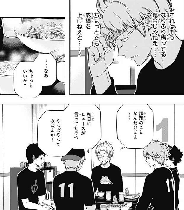 諏訪も、晩メシ当番いけんのか?と、話しかけますが、やはり会話が成立せず、諏訪も会話を諦めます。晩メシ当番は最初、諏訪がやろうとしますが、三雲の課題もかなり追いついてきているという事で、三雲が晩メシ当番を手伝うことになります。一方、若村11番隊の若村は、3日目の順位も最下位という状況に悩んでいました。