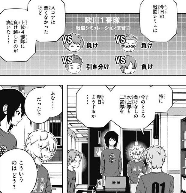 歌川1番隊の戦闘シミュ2日目は、スコアは悪くなかったようですが総合順位 上位4チーム、水上隊、古寺隊、村上隊、二宮隊に負け越してたいようで、明日の戦闘シミュをどうするか、を話し合っています。特に水上隊と二宮隊は負けなしで、対策にいい手が思い浮かばないようですが、空閑が何らかのアイデアを歌川に提案します。