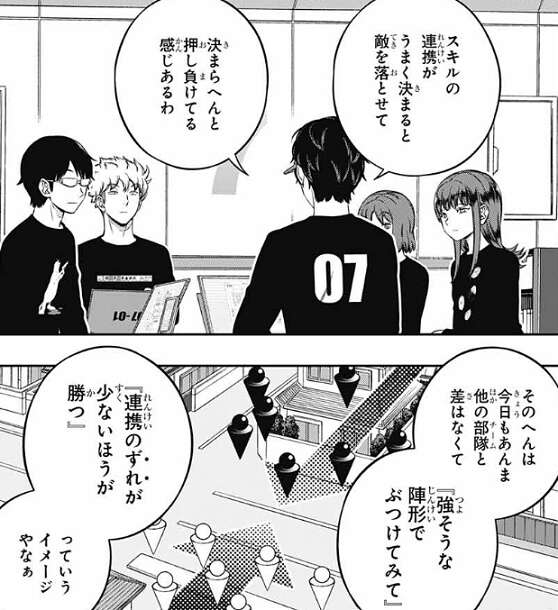 そして、再び諏訪7番隊に場面は戻り、戦闘シミュ3日目の勝てそうなネタを全員で話し合っています。隠岐はスキルの連携が上手く決まらないから負けている感じがするので、強そうなフォーメーションをぶつけて、連携のズレが少ない方が勝つ、と意見を出します。