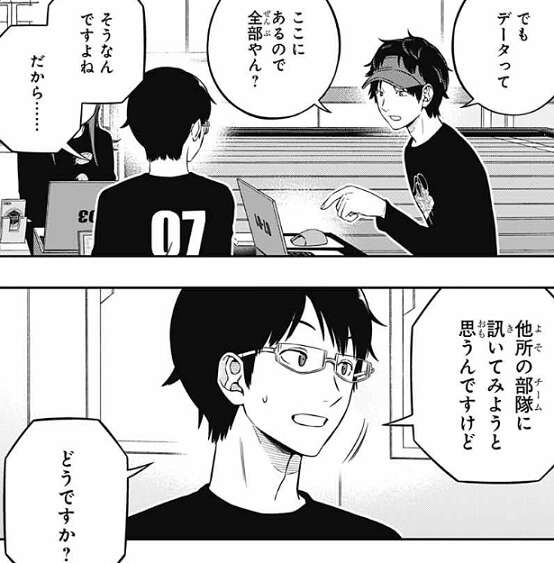 諏訪は古寺に連絡すると、いきなり挨拶の後に情報をよこせ、と切り出します。古寺6番隊と組んでやる、と諏訪は言い、ネタを共有したほうが戦闘シミュの勝率 上がんだろ、と諏訪は古寺6番隊と諏訪7番隊が組むメリットを説明し、情報をよこすように提案します。突然の諏訪からの提案に古寺は戸惑い、順位で勝っているうちのチームにはメリットがないですよね?と、諏訪の提案に古寺は反論します。