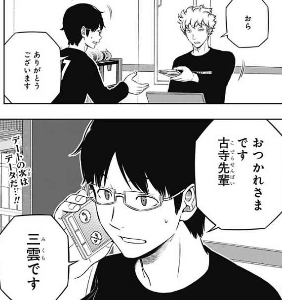 本気で勝つつもりなら、と諏訪に言われさらに、やる気がないなら村上のとこに話 持っていくだけ、とも言われた古寺は諏訪の話に半ば強引に乗ることになります。上手く古寺と話をまとめた諏訪はデバイスを三雲に渡し、古寺と話をするように促します。三雲は古寺に挨拶をすると、早速データについて話を始めようとします。