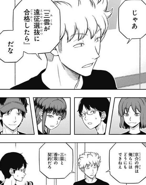 すると諏訪が、じゃあ『三雲が遠征選抜に合格したら』だな、と言い三雲の遠征選抜合格が条件だと言います。三雲と香取の契約だから、俺らにはどうにもできない、と諏訪は続けて言うと香取は一人、悩みだします。