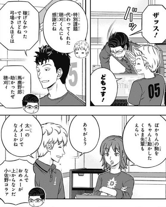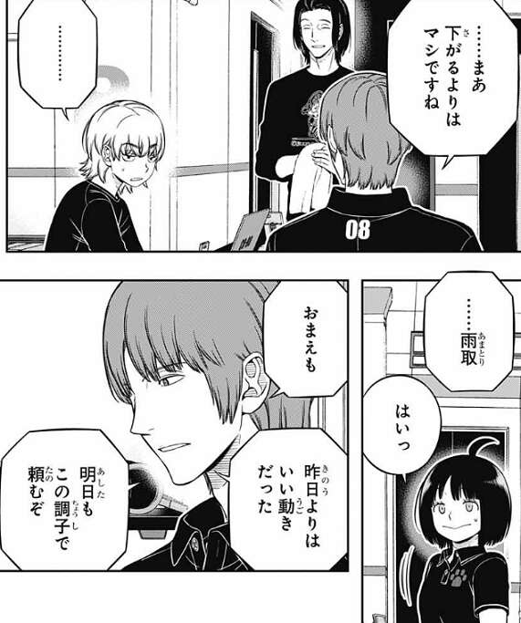 東から、たった1日でこれだけ上がれば大したもんだ、と二宮は話を振られますが、下がるよりはマシですね、と厳しい言葉ながら、二宮からも絵馬は評価されます。さらに、昨日よりはいい動きだった、明日もこの調子で頼むぞ、と雨取も二宮から褒められ、雨取は嬉しそうに返事をします。もしかしたら二宮にとってはこの言い方でも十分、絵馬と雨取を褒めているのかもしれません、二宮は表情が乏しいのでいまいち分かりづらいですが…。