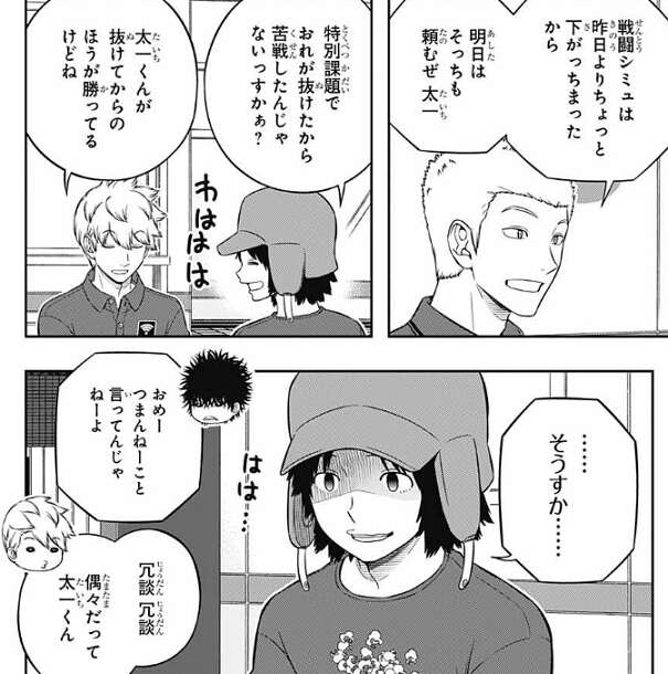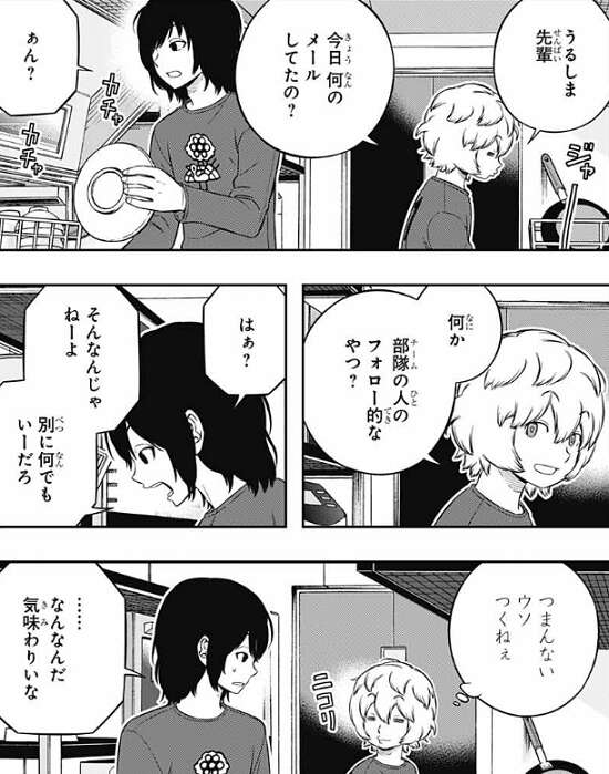 歌川1番隊では、空閑と漆間が食器洗いを一緒にやっています。食器洗いをしながらの会話で、空閑は今日漆間がメールをしていた事を話題にし、何かチームの人のフォロー的なやつ?と、聞きますが、漆間はそんなんじゃないと否定します。しかし、空閑はサイドエフェクトで漆間が嘘を言っているのが見破ったようです。しかし、漆間のこの嘘は照れ隠しだと分かっているのか、つまんないウソつくねぇ、と空閑は思いながらも表情は笑顔です。漆間はそんな空閑の笑顔を見て意味が分からず、……なんなんだ気味わりいな、とつぶやきます。
