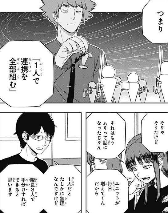 つまり、『1人で連携を全部組む』という事ですが、それはユニットが毎日増えていくからムリって話になったじゃん、と香取は反論します。それに対して三雲は、隊長3人で手分けすればできると思う、と言います。