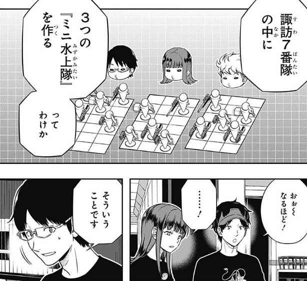 それを聞き諏訪が、諏訪7番隊の中に、諏訪隊の諏訪、香取隊の香取、玉狛第2の三雲で3つの『ミニ水上隊』を作る、という三雲の結論を代弁します。