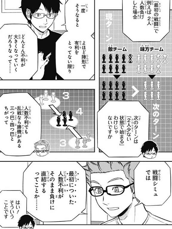 『最初の戦闘』とは『試合の中で最初にユニットがぶつかったターン』の事のようで、三雲は、『最初の戦闘』でほとんど勝敗が決まってるんじゃないかと思っている、と自分の考えを6番隊に話します。
