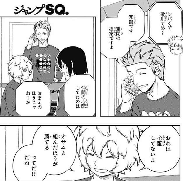すると宇井が、んじゃ訊いとこ、と対戦相手の能力データで虫食いになっている所を開示し合おうと言います。全部のチームは大変ですが、上位チームの二宮隊と水上隊の能力データは共有したほうが捗ると思う、という事になり宇井と六田はお互いのデータを送り合います。さらに香取が持っている万能適正スキルの情報も交換します。適正系スキルはどれも微妙だと香取は言い、万能適正スキルも雑魚スキルだと、香取は断言します。